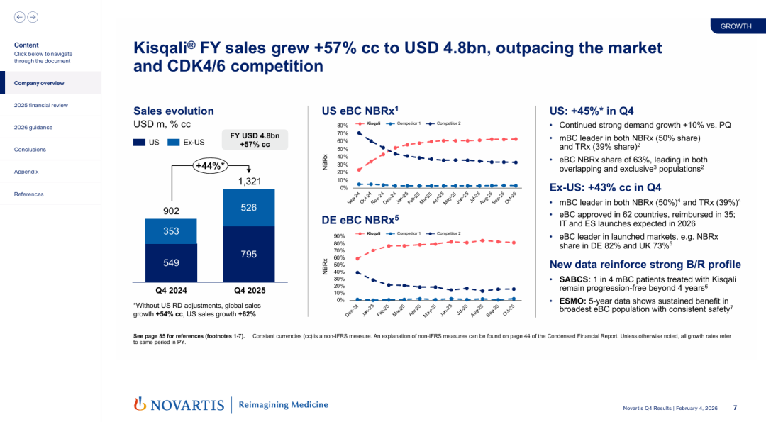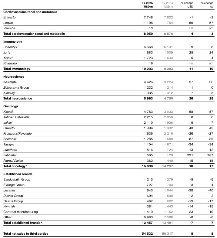值得一提的是,Entresto(沙库巴曲缬沙坦)的专利保护期已在2025年失效,并且今年将按美国医保谈判结果执行新的价格。2025年,该产品的销售额已经开始下滑,全年收入77.48亿美元,低于去年的78.22亿美元。此外,Kisqali(瑞波西利)保持强劲增长,不过,该产品在上个月被选为美国第三轮医保谈判目标产品。