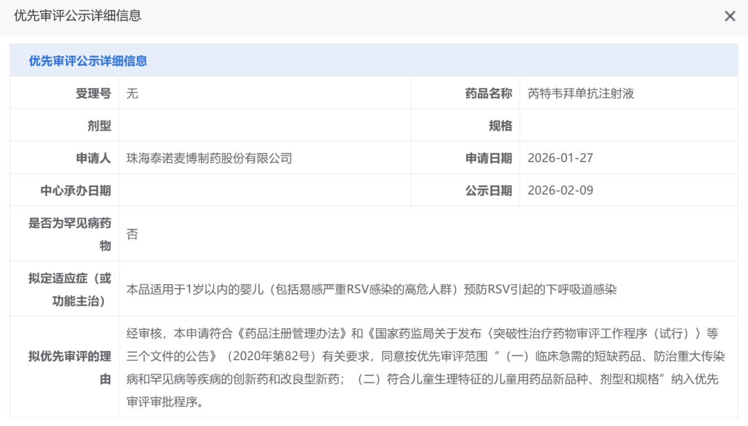 2月9日,CDE网站显示,泰诺麦博的芮特韦拜单抗(Retavibart,TNM001)申报上市,用于1岁以内婴儿(包括易感严重呼吸道合胞病毒(RSV)感染的高危人群)预防RSV引起的下呼吸道感染(LRTI)。该药物是第二款拟纳入优先审批的国产RSV抗体,瑞阳制药的库莱韦单抗刚刚在上个月被纳入优先审评。