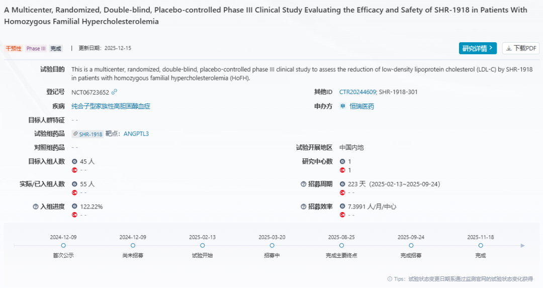 医药魔方数据库显示,恒瑞医药在2024年12月启动了SHR-1918治疗HoFH的注册性III期研究,该研究的状态已在2025年11月变更为“完成”,相关结果尚未披露。
