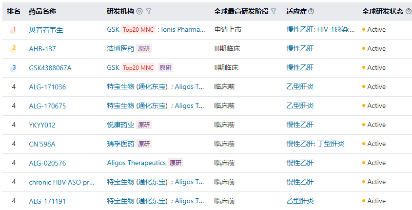 贝普若韦生是GSK从Ionis引进的一种反义寡核苷酸(ASO)疗法,旨在通过抑制乙型肝炎病毒DNA的复制,进而抑制血液中乙型肝炎表面抗原(HBsAg)水平,并刺激免疫系统产生持久应答。该药物是慢性乙肝领域首款完成III期研究的小核酸药物。